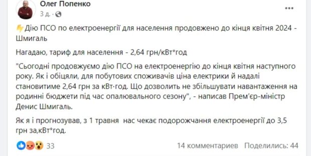 "Сегодня продолжаем действие ПСО на электроэнергию до конца апреля следующего года. Как и обещали, для бытовых потребителей цена электричества и дальше будет составлять 2,64 грн за кВт⋅час. Что позволит не увеличивать нагрузку на семейные бюджеты во время отопительного сезона."