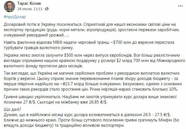 Осенью в Украине ожидается скачок доллара вверх. Об этом написал у себя в Facebook президент инвестиционной компании “Универ” Тарас Козак. Аналитик ожидает, что начиная с сентября доллар в Украине может подняться до отметки 27,5 грн./дол.