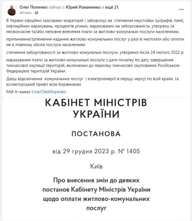 Кабинет министров Украины отменил запрет на прекращение жилищно-коммунальных услуг, начисление и взыскание неустойки (штрафов, пени) и взыскание задолженности по коммуналке в случае неуплаты. Об этом стало известно из Постановления от 29 декабря 2023 года №1405.