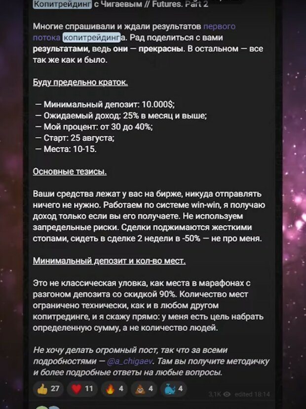 Mobimes рассказал, что наткнулся на блог Чигаева около года назад. Он регулярно следил за его Телеграм-каналом, где криптоблогер делился аналитикой и инвестиционными стратегиями. Со временем Чигаев объявил о запуске программы копитрейдинга — схемы, при которой инвесторы передают средства условному «менеджеру», а тот копирует сделки успешных трейдеров.