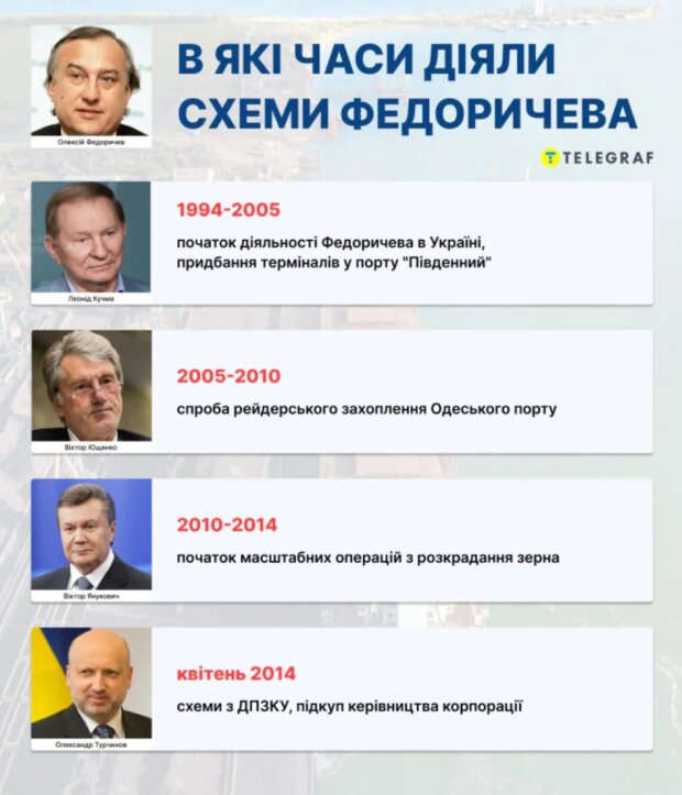 Деятельность Федоричева в Украине началась на заре 2000-х. Именно тогда он полностью выкупил самые большие морские терминалы в порту “Южный” под Одессой — “ТИС-Зерно” и “ТИС-Минеральные удобрения”.