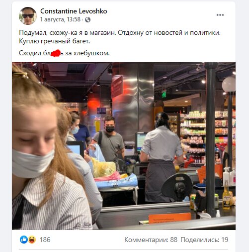 "Подумав, сходжу-но я в магазин. Відпочину від новин і політики. Куплю гречаний багет. Сходив ... за хлібцем", - іронізує автор публікації.