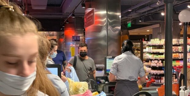 Зеленський прийшов в магазин без костюма, а в самому звичайному літньому вбранні: сіра футболка, чорна маска, непримітний рюкзак.