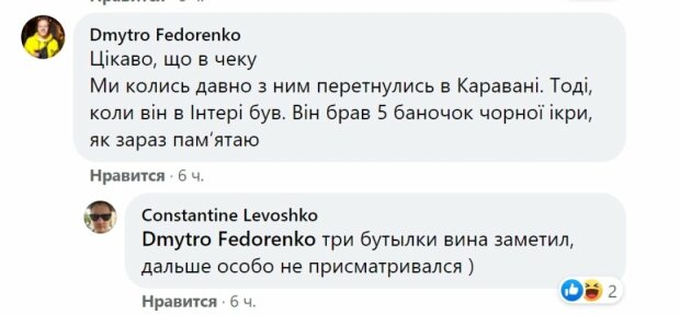 "Цікаво, що в чеку. Ми колись давно з ним перетнулися в Каравані. Тоді, коли він в Інтері був. Він брав 5 баночок чорної ікри, як зараз пам'ятаю", - зазначив Дмитро Федоренко.
