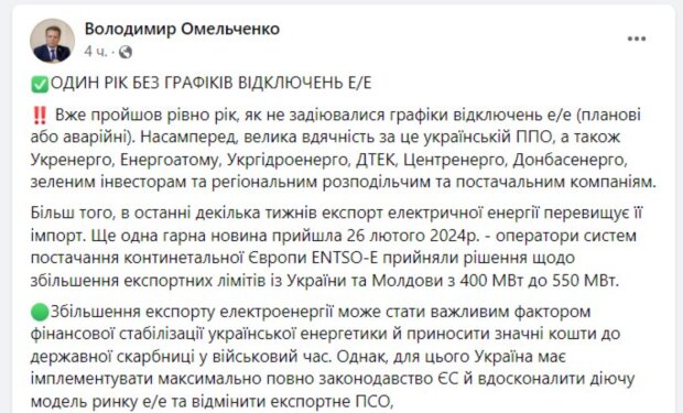 Деякі експерти заявляли, що ситуація з електрикою може бути навіть гіршою, ніж минулого року. Але, дякувати Богу та нашим ежнергетикам, ми закінчуємо зиму зі світлом і з цього приводу зробила важливу заяву Володимир Омельченко.