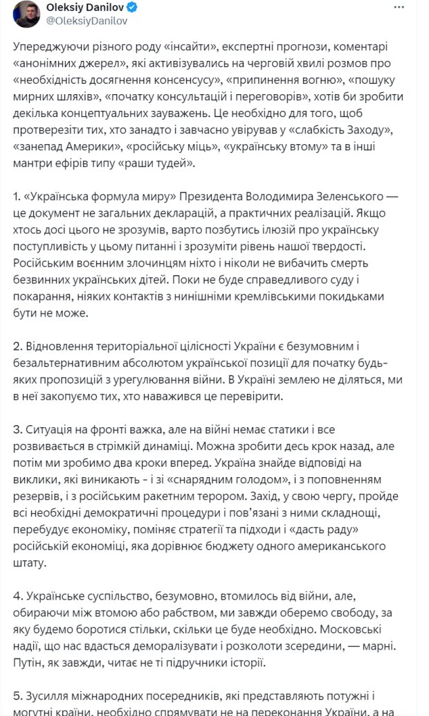"Попереджаючи різного роду "інсайти", експертні прогнози, коментарі "анонімних джерел", які активізувалися на черговій хвилі розмов про "необхідність досягнення консенсусу", "припинення вогню", "пошуку мирних шляхів", "початку консультацій та переговорів", хотів би зробити кілька концептуальних зауважень: це необхідно для того, щоб протверезити тих, хто надто і заздалегідь увірував у "слабкість Заходу", "занепад Америки", "російську міць", "українську втому" та інші мантри ефірів типу "розв'яжи туди", - зазначив він.