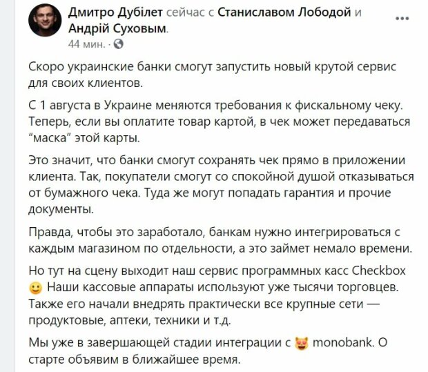 З 1 серпня в Україні відбудуться зміни у вимогах до фіскальних чеків. Це дозволить Monobank та іншим великим фінансовим організаціям запустити новий сервіс для своїх клієнтів. Про це пише в соціальній мережі Facebook колишній менеджер Приватбанку і співзасновник "Моно" Дмитро Дубілет.