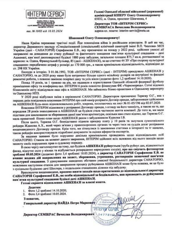 У 2021 році Південно-Західний апеляційний господарський суд ухвалив, що жодних підстав займати приміщення дачі Ашкеназі компанія «Інтерім сервіс» не має з 2017 року. Крім цього, експертиза встановила, що господарювання Чухна-Семікраса завдало збитків на суму у 6,23 млн грн. Ше 2,3 млн грн «Інтерім» заборгував санаторію, в якості невиплаченої орендної плати. Втім, реальні збитки можуть бути набагато більшими – понад 20 млн грн.